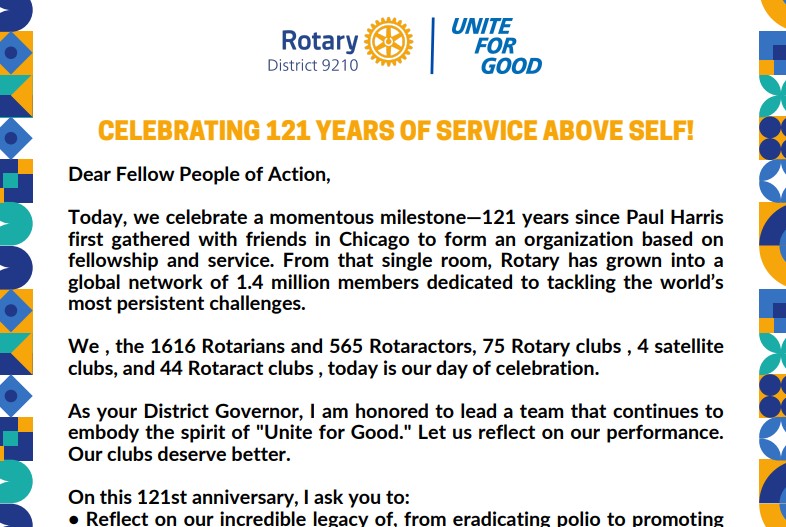 Today, we celebrate a momentous milestone—123 years since Paul Harris first gathered with friends in Chicago to form an organization based on fellowship and service. From that single room, Rotary has grown into a global network of 1.4 million members dedicated to...